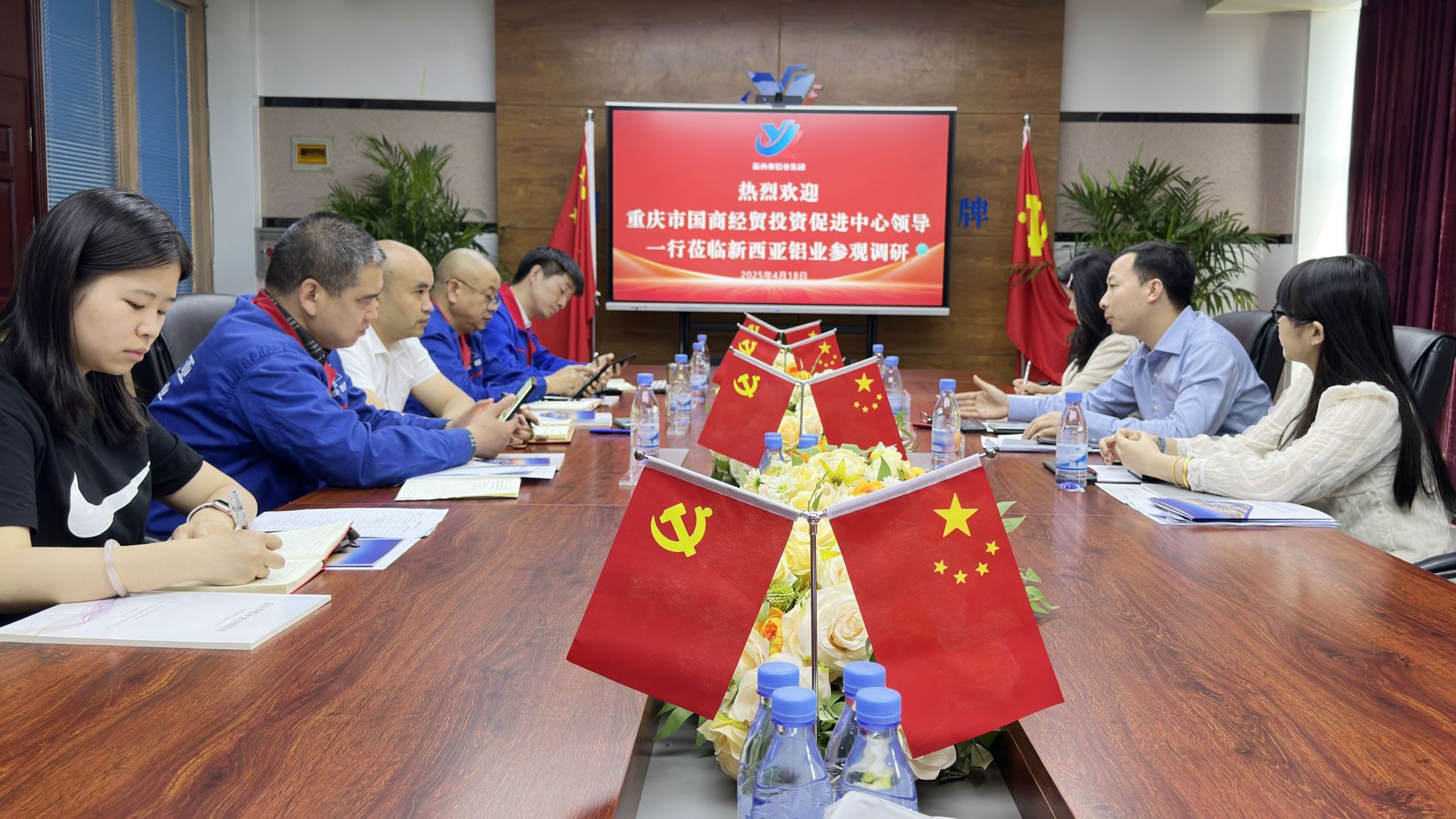 4月18日,重慶市國際商貿(mào)經(jīng)貿(mào)投資促進(jìn)中心主任蔣儲鴻一行蒞臨新西亞鋁業(yè)集團(tuán)進(jìn)行參觀調(diào)研,集團(tuán)公司總經(jīng)理劉斌及相關(guān)業(yè)務(wù)負(fù)責(zé)人熱情接待。