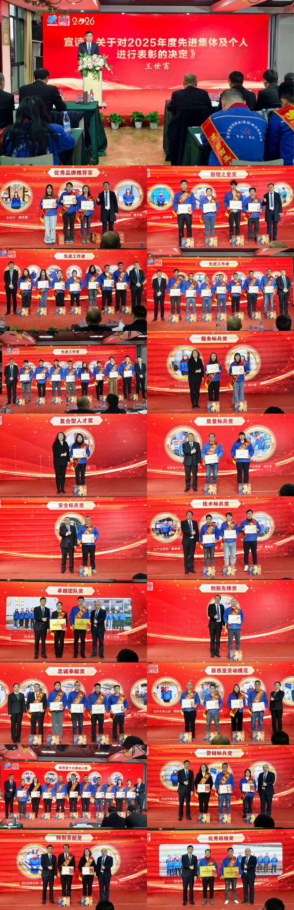 大會對2025年度涌現(xiàn)出的先進集體和個人進行了隆重表彰。宣讀了《關(guān)于表彰2025年度先進集體及先進個人的決定》,并向卓越團隊獎、優(yōu)秀班組獎、新西亞十大感動人物、勞動模范及各類標兵獲得者頒發(fā)了榮譽獎項。