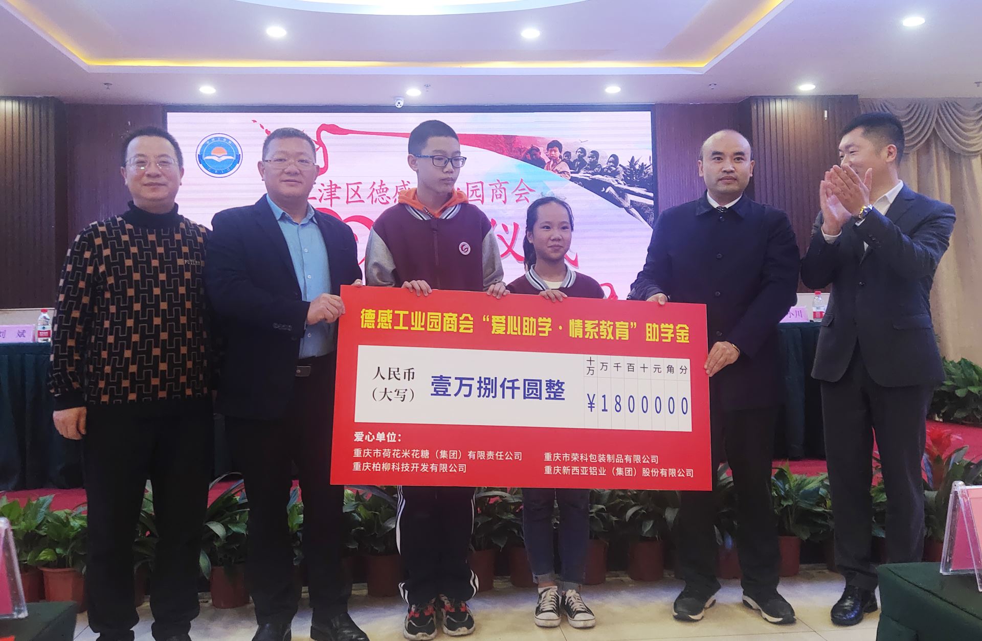 2020年10月16日,江津區(qū)德感工業(yè)園商會第三屆一次會員大會在禾宴大酒店隆重舉行,作為本次會議主要議程,會員企業(yè)—重慶市荷花米花糖(集團)有限公司、重慶市榮科包裝制品有限公司、重慶柏柳開發(fā)有限公司、重慶新西亞鋁業(yè)(集團)股份有限公司,共同出席了“愛心助學·情系教育”活動儀式。江津區(qū)委常委、區(qū)委統(tǒng)戰(zhàn)部部長楊利,江津區(qū)委常委、德感工業(yè)園發(fā)展中心黨委書記、主任李祖明,德感工業(yè)園發(fā)展中心黨委委員、副主任朱志明,江津區(qū)工商聯(lián)(總商會)主席鄒勇,江津區(qū)工商聯(lián)(總商會)副主席廖代旭、江津團區(qū)委副書記陳奕池、江津區(qū)實驗中學副校長柴瑛及德感商會92名會員共同見證了這一時刻。