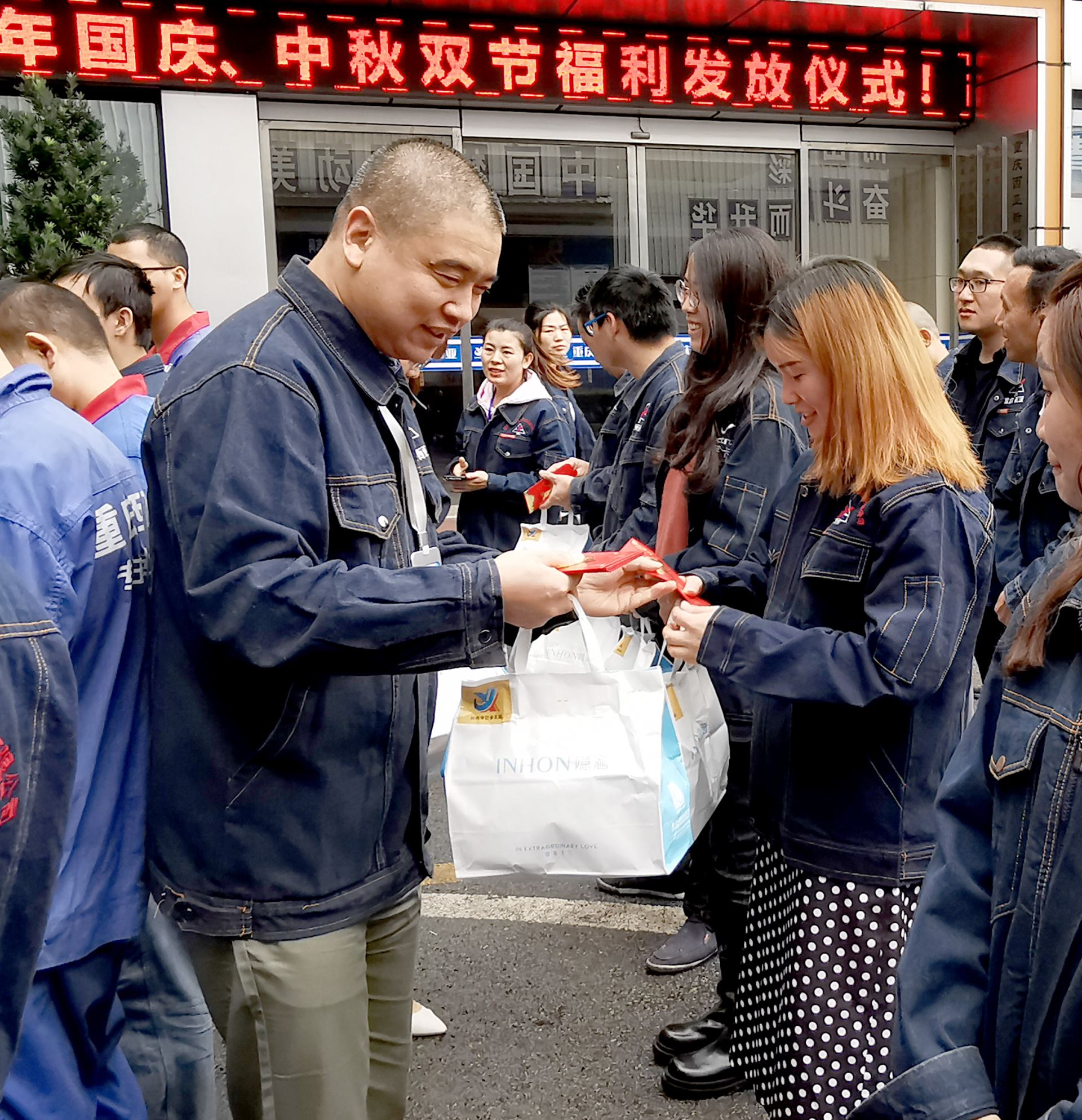 活動現(xiàn)場,經(jīng)營班子成員將國慶中秋雙節(jié)福利禮品和員工家屬慰問金發(fā)放到每一位員工手中。
